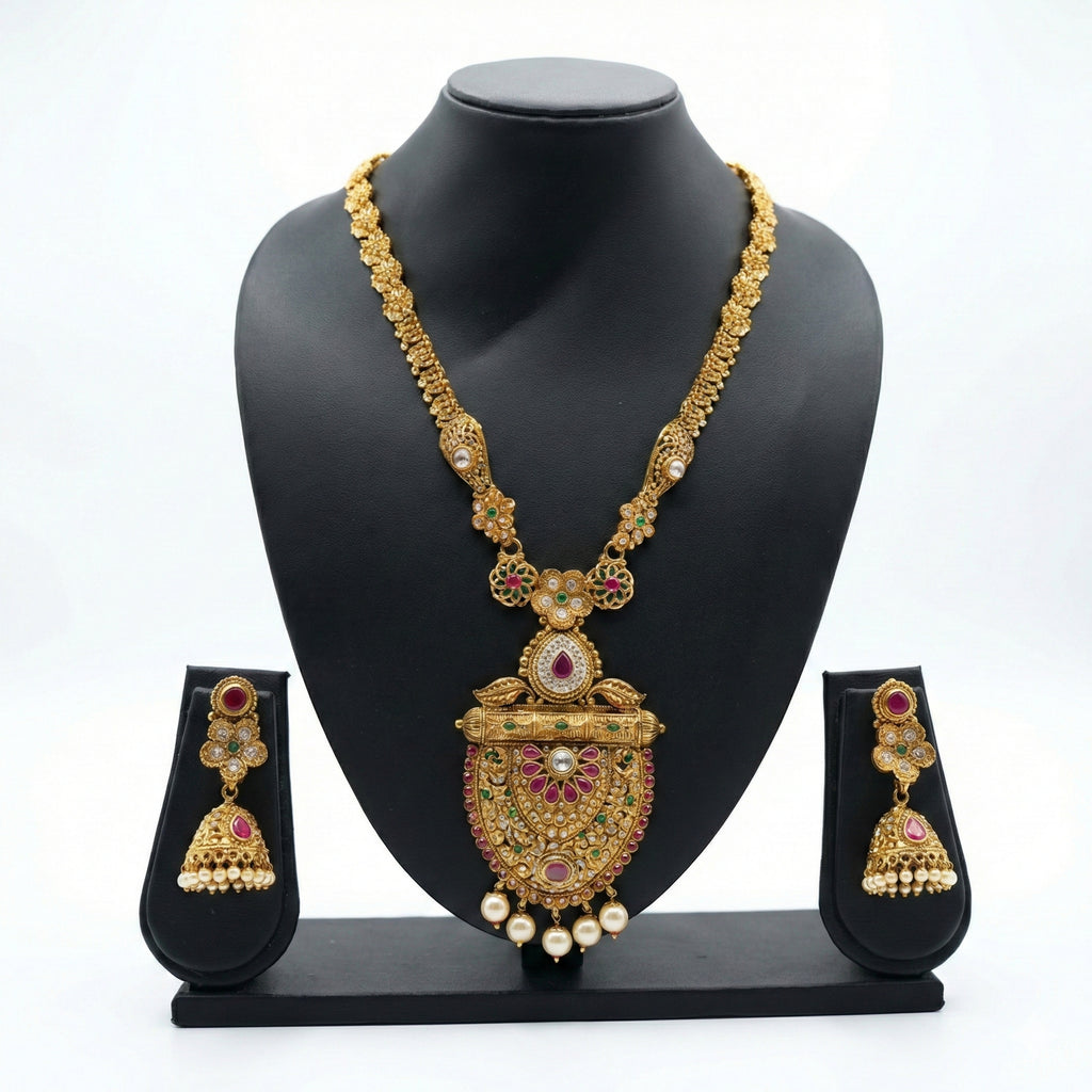 Embrace the divine beauty of South Indian temple jewellery with this magnificent Gold Temple Necklace Set. Featuring intricate temple motifs, goddess-inspired designs, and a rich antique gold finish, this set pays homage to centuries of Indian craftsmanship.Complete with ornate jhumka earrings and, this 3-piece set is perfect for traditional ceremonies, temple visits, and South Indian weddings.Traditional temple jewellery design 3-piece set: necklace + jhumka earrings Antique gold-tone finish Intricate goddess and floral motifs Adjustable closureI deal for Bharatanatyam, weddings, and poojas