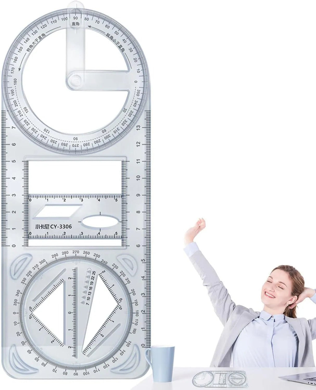 360° rotatable protractor and multiple measuring scales.