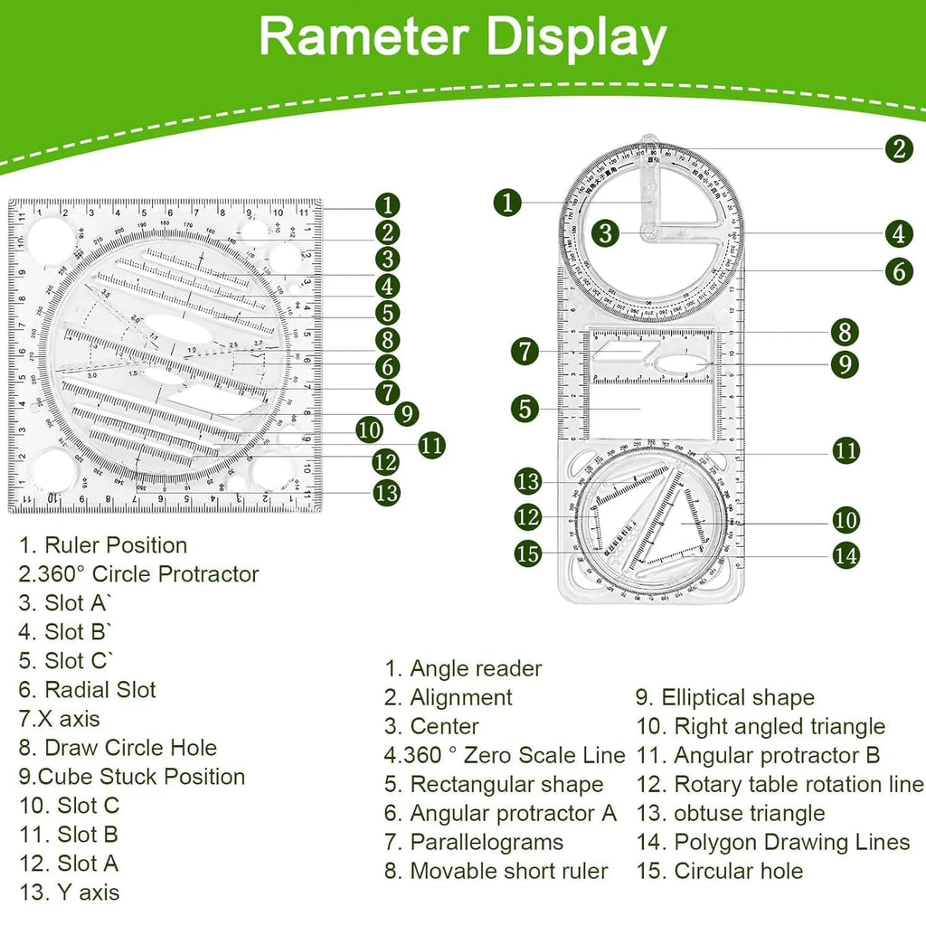 Upgrade your drawing precision with the Multi-Functional Geometry Ruler, a smart all-in-one measuring tool for students, architects, engineers, and artists. Combining a protractor, straight ruler, compass, triangle ruler, and angle gauge into one sleek design, this tool makes geometry, drafting, and design tasks easier and more accurate.