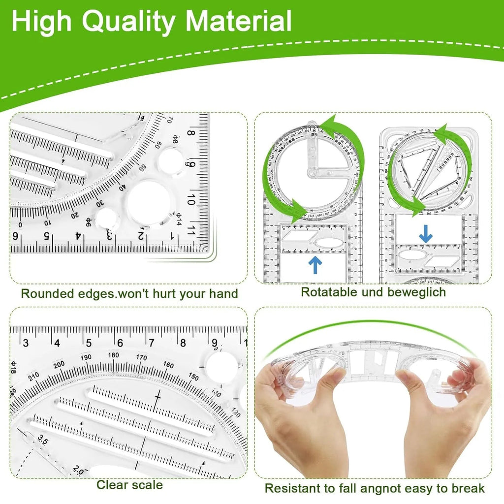 📏 All-in-One Design – Combines multiple rulers, protractor, compass, and measurement scales in one tool.