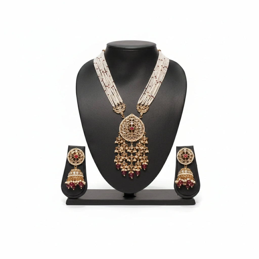 Multilayer Pearl Rani Haar Necklace Set with Kundan Pendant & Jhumka Earrings | Ruby Bead Long Necklace | Gold-Plated Bridal Jewellery Set | Traditional Indian Wedding Jewellery